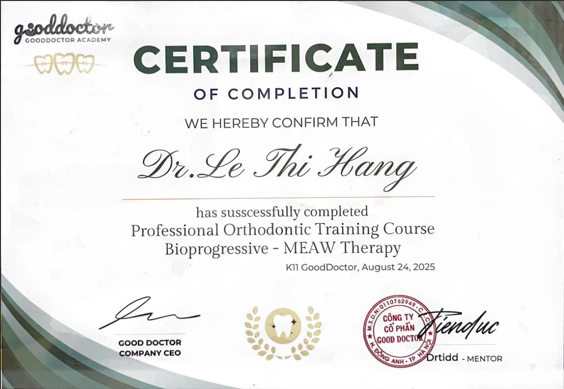 Trên hành trình học tập và làm nghề, bác sĩ Lê Thị Hằng không ngại những khó khăn, luôn nỗ lực tìm tòi và hoàn thiện chuyên môn để mang lại kết quả điều trị tối ưu nhất cho khách hàng. Với niềm đam mê chỉnh nha sâu sắc, bác sĩ đã điều trị thành công nhiều ca niềng răng phức tạp, giúp khách hàng tự tin với nụ cười mới.