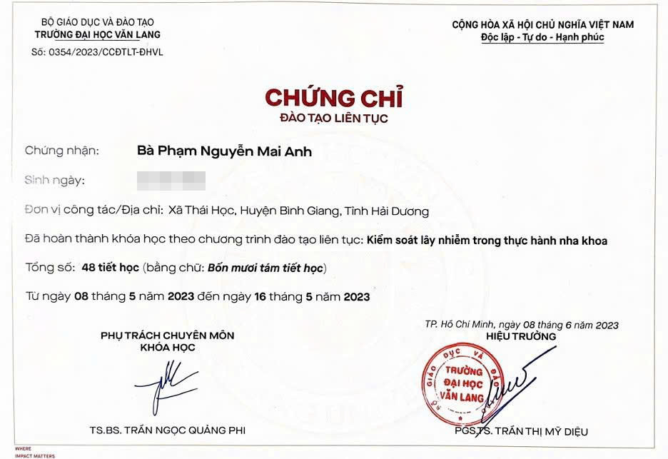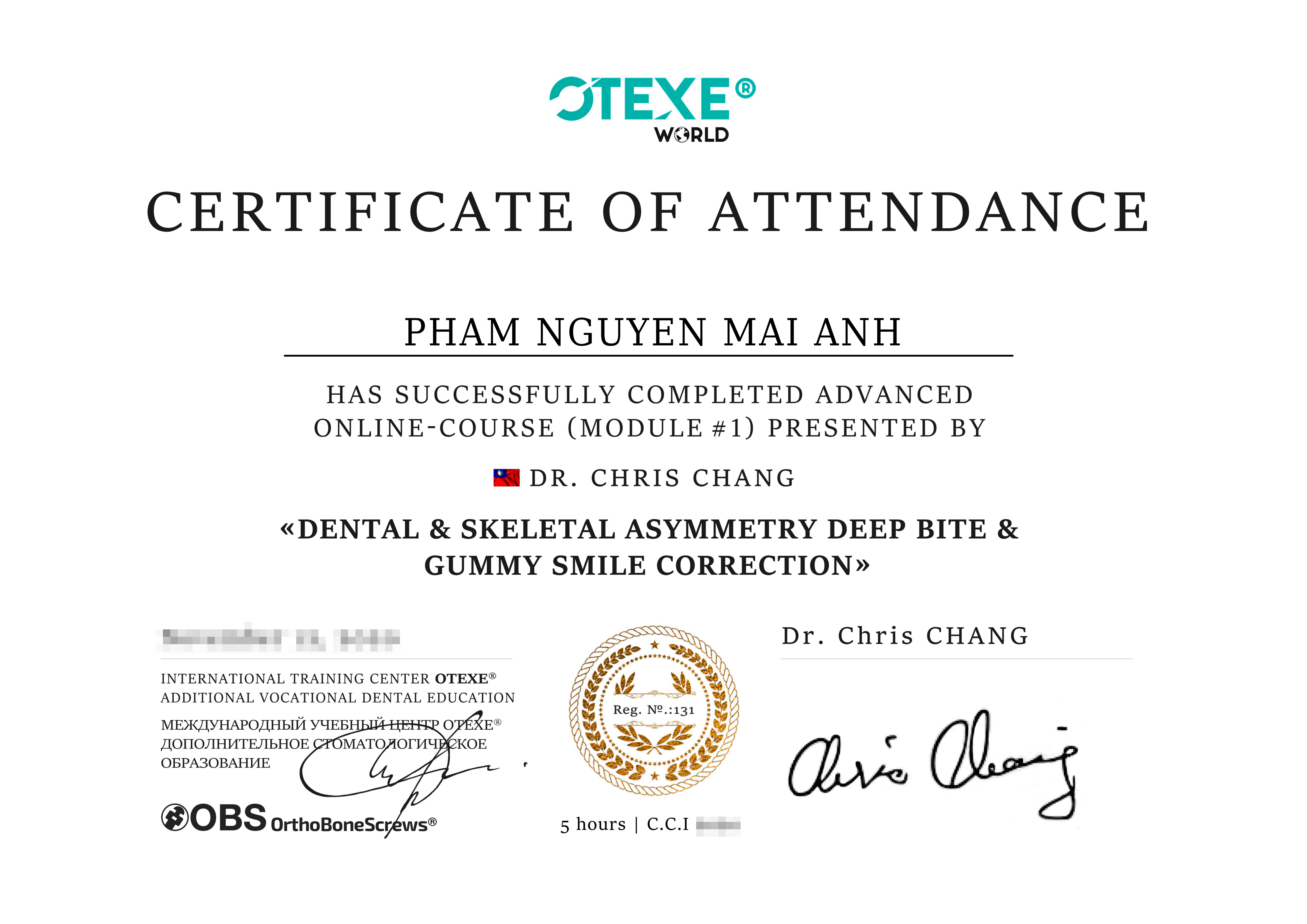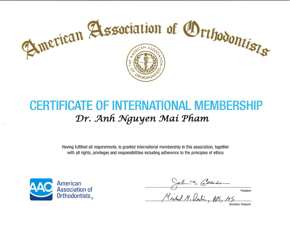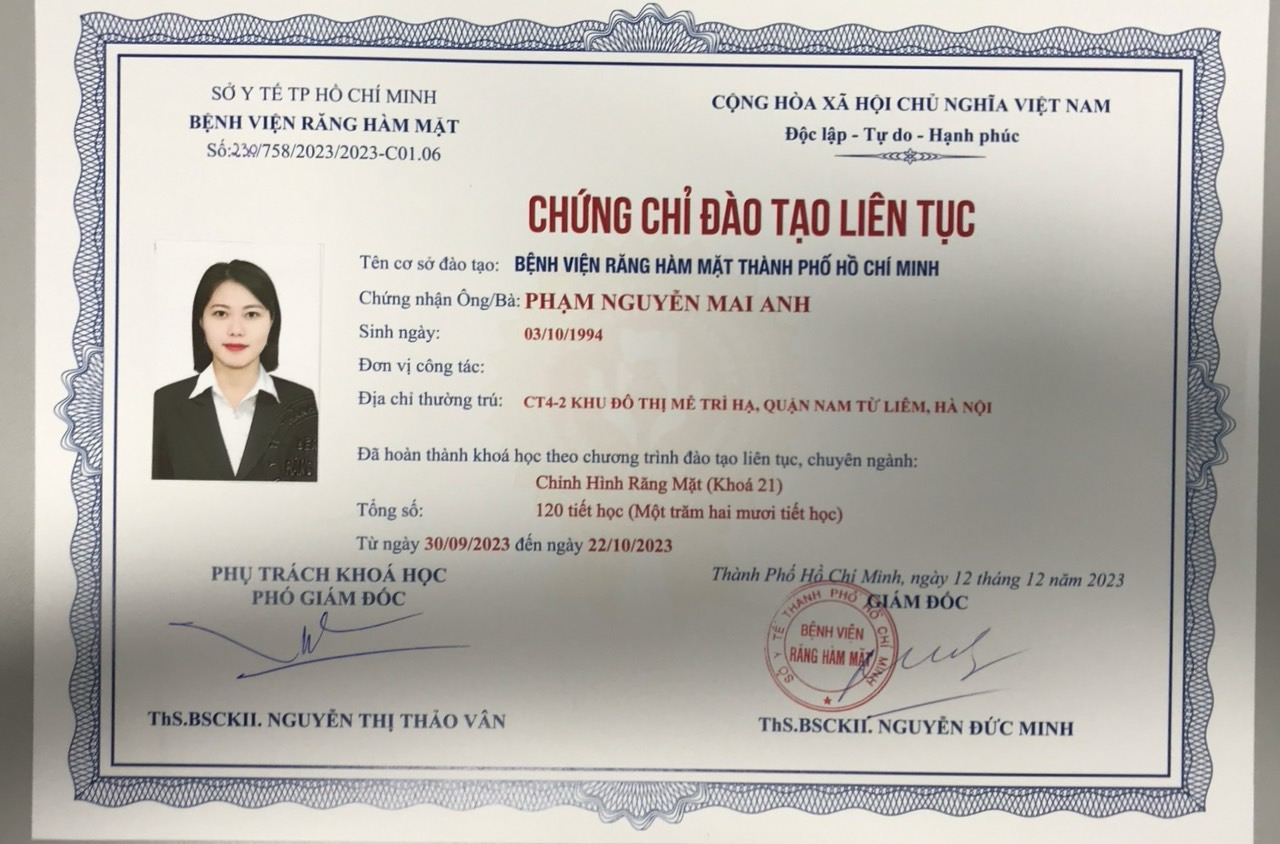Bác sĩ niềng răng Phạm Nguyễn Mai Anh là thành viên của Liên đoàn Chỉnh nha Thế giới (WFO), tu nghiệp chuyên sâu chương trình chỉnh nha tại Đại học Niigata, Nhật Bản. Sau khi tốt nghiệp bác sĩ chính quy ngành Răng – Hàm – Mặt, Đại học Y Hà Nội, bác sĩ Mai Anh tiếp tục theo đuổi niềm đam mê chỉnh nha bằng việc tham gia hàng loạt khóa đào tạo chuyên sâu trong và ngoài nước.