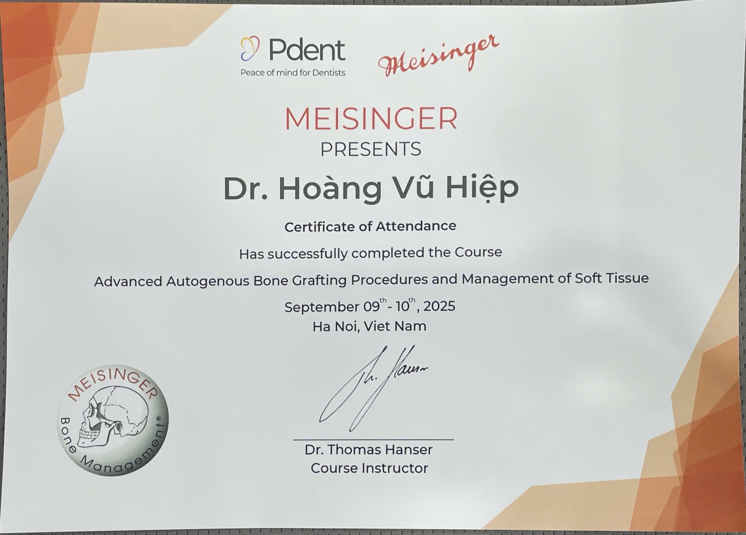 Bác sĩ Hoàng Vũ Hiệp tốt nghiệp Đại học Y Hà Nội – cái nôi đào tạo y khoa hàng đầu cả nước, sở hữu nền tảng chuyên môn vững chắc và tư duy điều trị bài bản. Trong quá trình hành nghề, bác sĩ không ngừng nâng cao tay nghề thông qua việc tham gia nhiều khóa đào tạo, chứng chỉ chuyên sâu về cấy ghép Implant trong và ngoài nước, đặc biệt là các kỹ thuật Implant hiện đại, Implant tức thì và xử lý ca phức tạp.