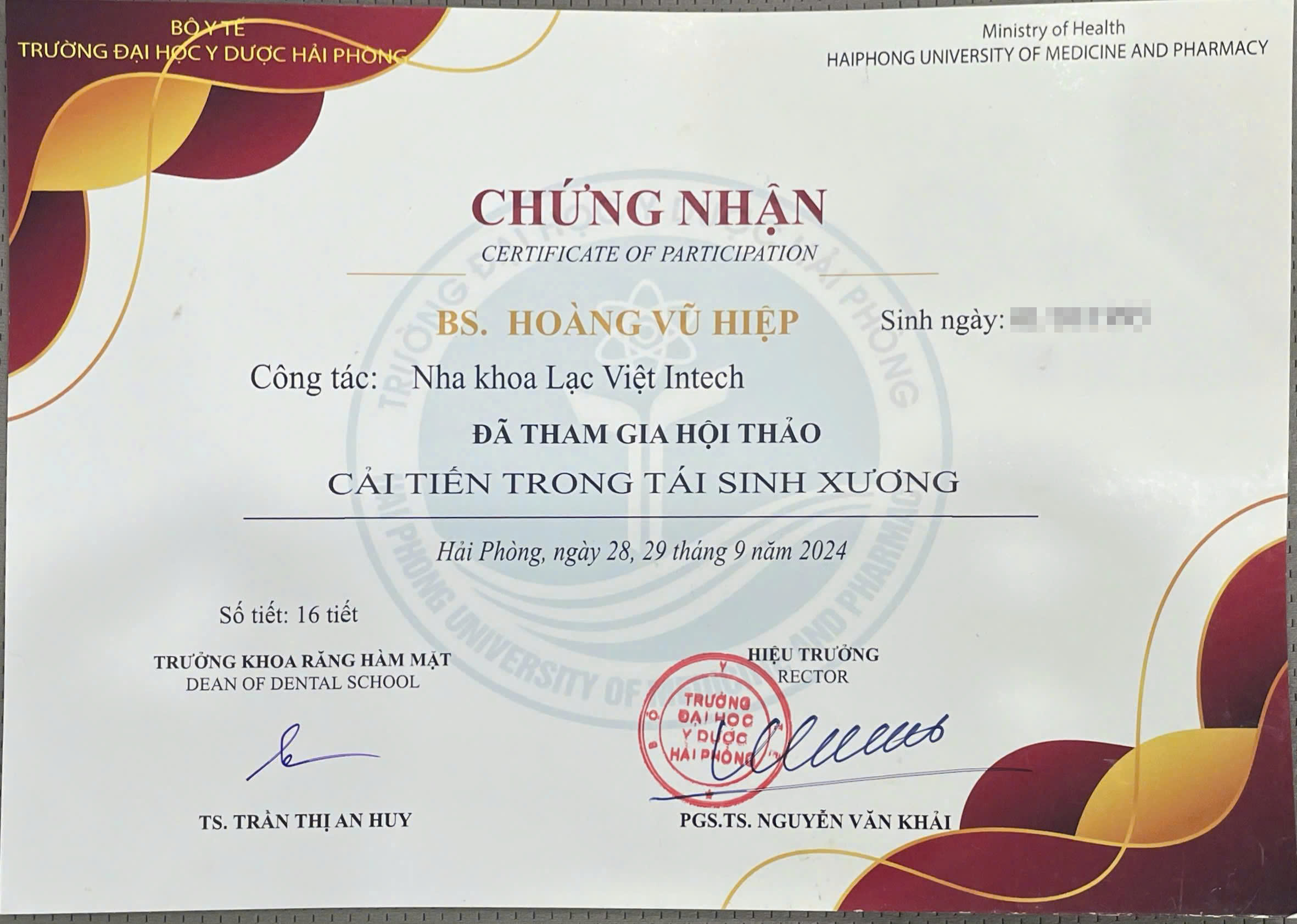 Với kinh nghiệm lâm sàng dày dặn, bác sĩ Hoàng Vũ Hiệp- Chuyên gia cấy ghép Implant tại Lạc Việt Intech luôn sẵn sàng tiếp nhận những ca khó, đòi hỏi độ chính xác cao và phác đồ điều trị cá nhân hóa. Sự tận tâm, chuẩn mực trong chuyên môn cùng kết quả điều trị bền vững đã giúp bác sĩ trở thành lựa chọn tin cậy của nhiều khách hàng trong nước và khách quốc tế, “chọn mặt gửi vàng” khi điều trị Implant tại Lạc Việt Intech.