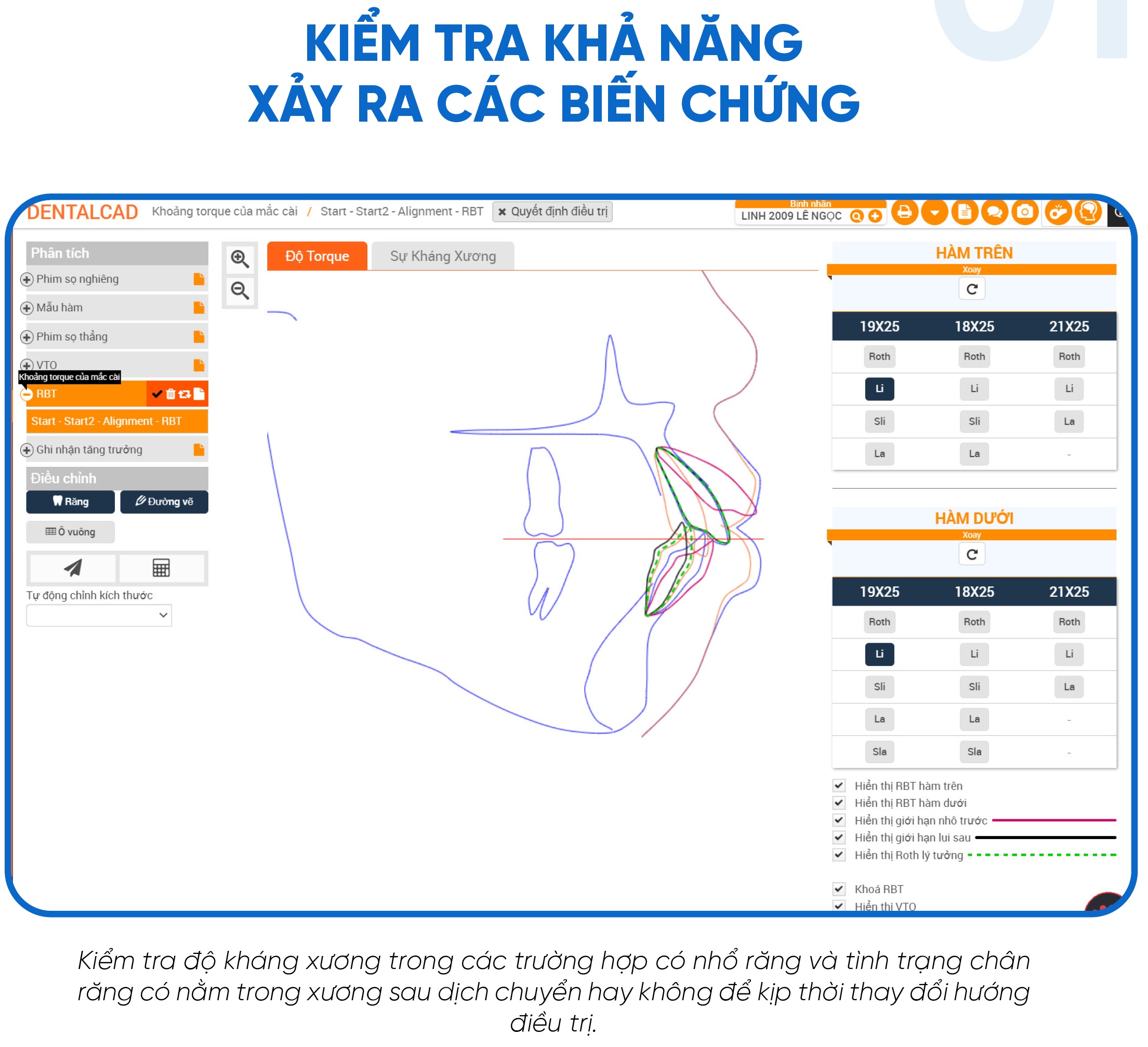 Tuy nhiên, với hệ thống phân tích và mô phỏng, bác sĩ có thể đánh giá trước những rủi ro này bằng cách theo dõi sự di chuyển của chân răng trong xương, đo mật độ xương và kiểm tra giới hạn sinh học. Nếu phát hiện nguy cơ, kế hoạch điều trị sẽ được điều chỉnh ngay từ đầu, thay vì xử lý hậu quả sau này.