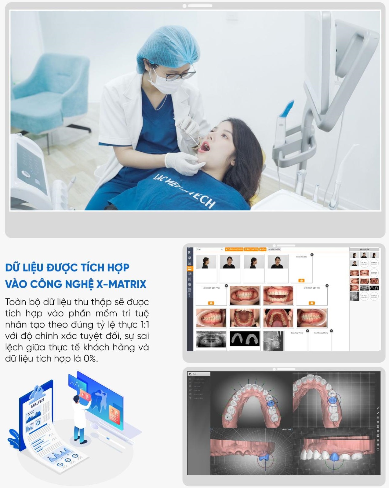 Tại Lạc Việt Intech, toàn bộ quy trình này được triển khai trên nền tảng giải pháp niềng răng X-Matrix, cho phép tích hợp dữ liệu – phân tích – mô phỏng trong một hệ thống thống nhất, giúp kiểm soát toàn bộ quá trình điều trị ngay từ trước khi gắn mắc cài.