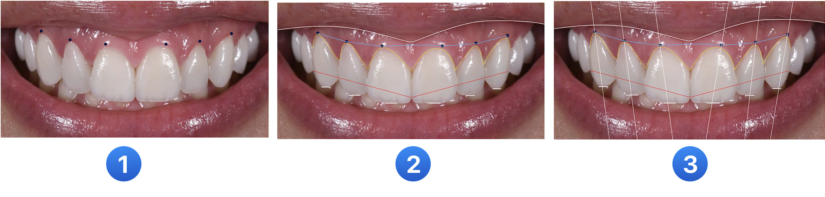 Trước tiên là các đường hướng dẫn ngang. Những đường này giúp bác sĩ xác định các yếu tố nền tảng như mặt phẳng cắn, mặt phẳng rìa cắn và đường viền lợi sao cho nụ cười không bị lệch, không bị “xéo” khi nhìn trực diện.