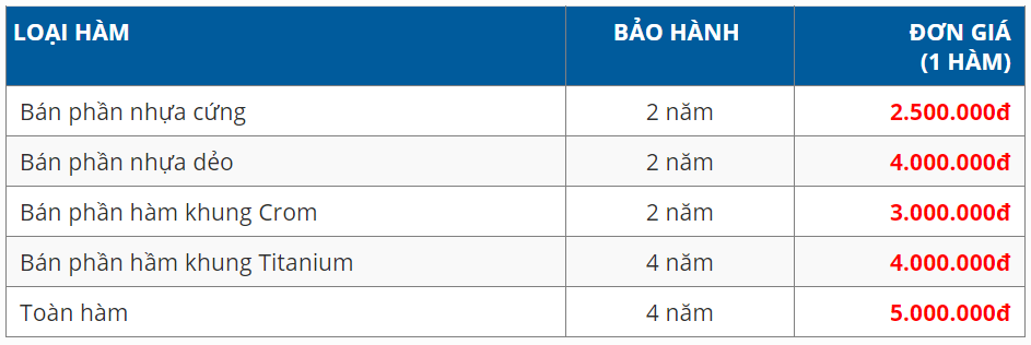 Đây là phương pháp phục hình có chi phí thấp nhất, chỉ từ 2–5 triệu đồng mỗi hàm. Hàm giả được chế tác từ nhựa hoặc sắt-crom, gắn chặt vào nướu bằng lực hút chân không hoặc móc kim loại. Khi đeo, hàm ôm sát nướu, tuy nhiên do không có chân răng thật hay trụ implant làm điểm tựa, nên sau một thời gian sử dụng, nướu có thể tiêu đi khiến hàm lỏng lẻo, dễ rơi ra khi nói chuyện hoặc ăn nhai.