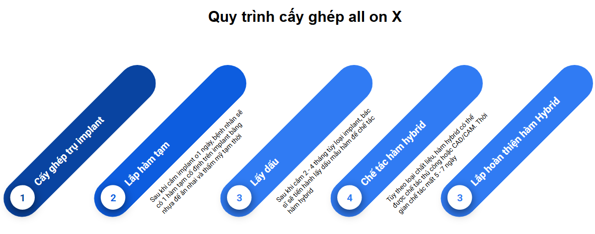 Quy trình trồng răng implant toàn hàm tại nha khoa Lạc Việt Intech gồm 5 bước.